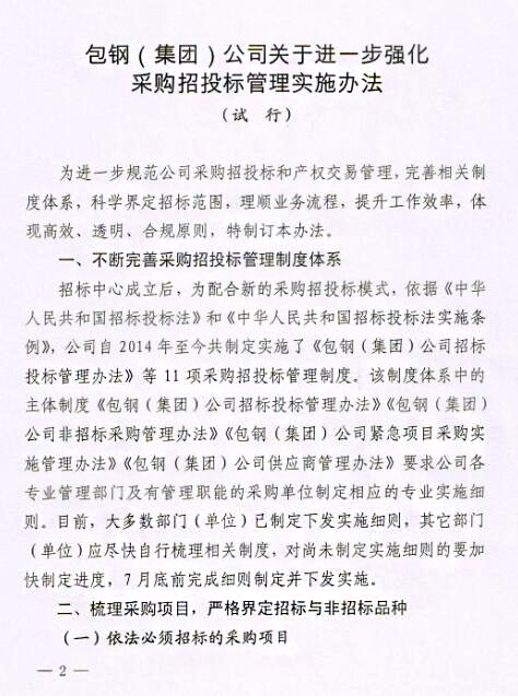 關(guān)于印發(fā)《包鋼(集團(tuán))公司關(guān)于進(jìn)一步強(qiáng)化采購招投標(biāo)管理實施辦法(試行)》的通知